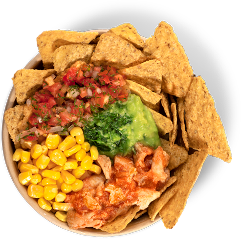 Tinga de pollo (ligeramente picante), lechuga, tomate, maíz, aguacate, nachos, arroz integral y salsa MUY.