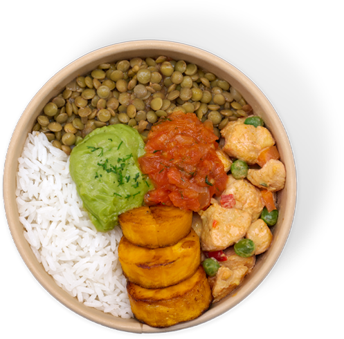 Pollo en cocción con vegetales, lentejas, maduro, hogao, guacamole y arroz blanco.