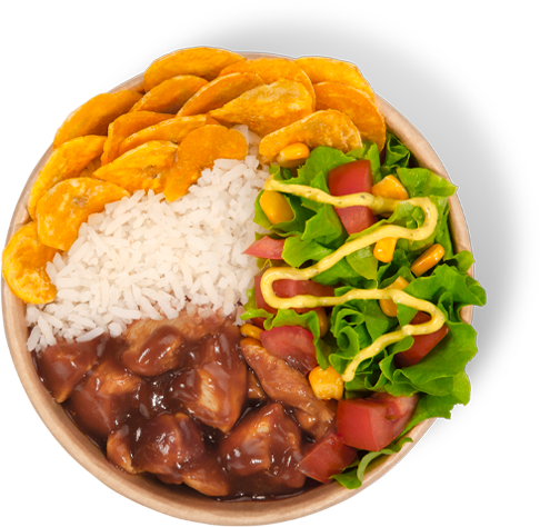 Pollo a la plancha, arroz integral, mix delechuga fresca,tomate, maíz tierno,crutones y salsa MUY.
